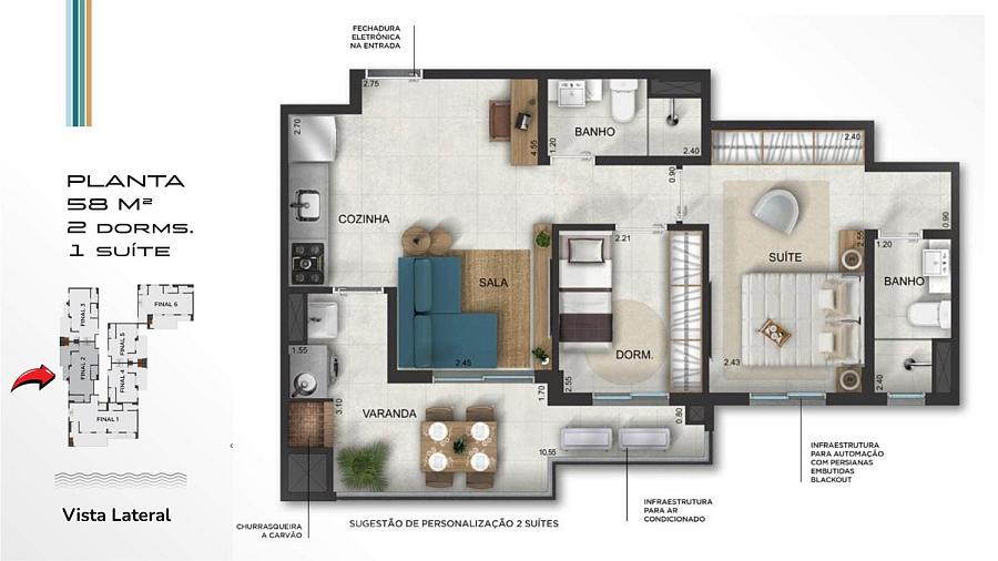 A planta de 58 m²  foi projetada para oferecer conforto, praticidade e aproveitamento inteligente dos espaços, perfeita para quem deseja morar próximo à praia com qualidade de vida ou investir em uma unidade altamente atrativa.