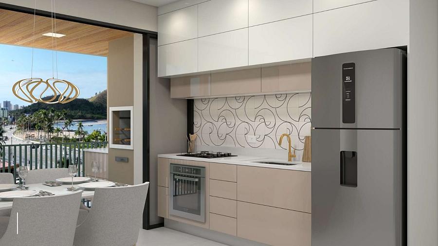 Living integrado com cozinha e sala, proporcionando maior amplitude e iluminação natural