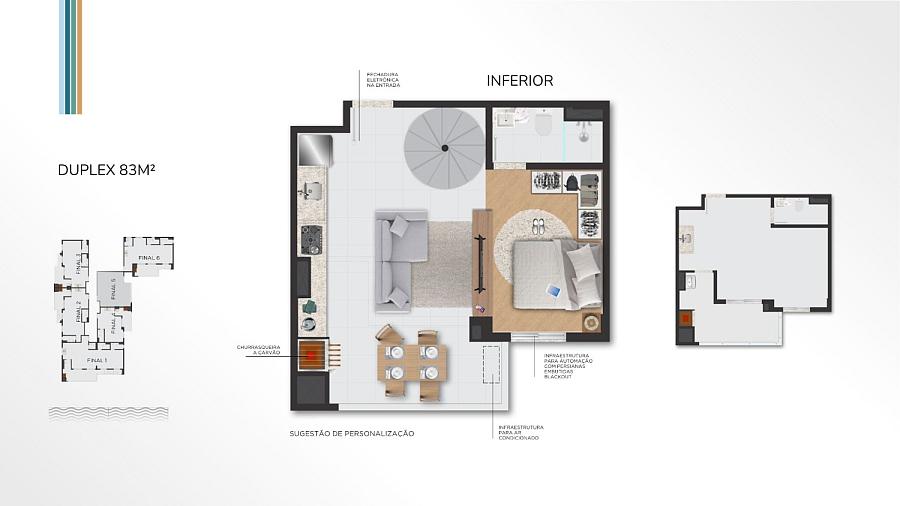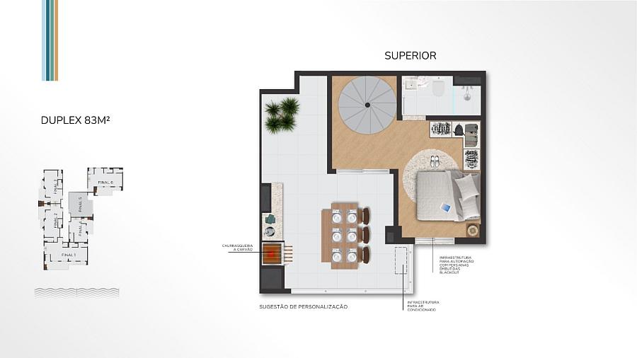 A planta de 83 m² Duplex foi projetada para oferecer conforto, praticidade e aproveitamento inteligente dos espaços, perfeita para quem deseja morar próximo à praia com qualidade de vida ou investir em uma unidade altamente atrativa.