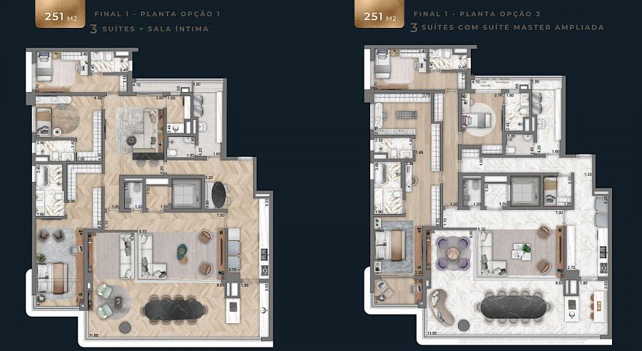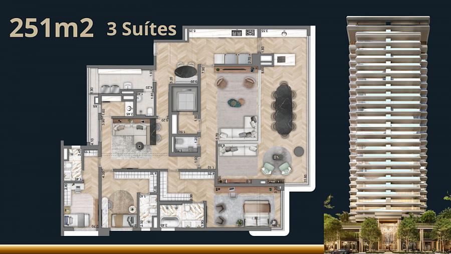 2. Tamanho espaçoso: Os apartamentos oferecem opções generosas de espaço, com unidades de 251m² e duplex de 452m². Essas metragens são ideais para quem valoriza o conforto e a amplitude dos ambientes.