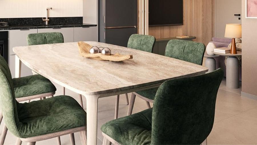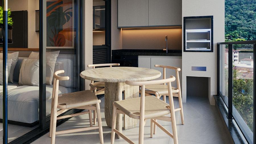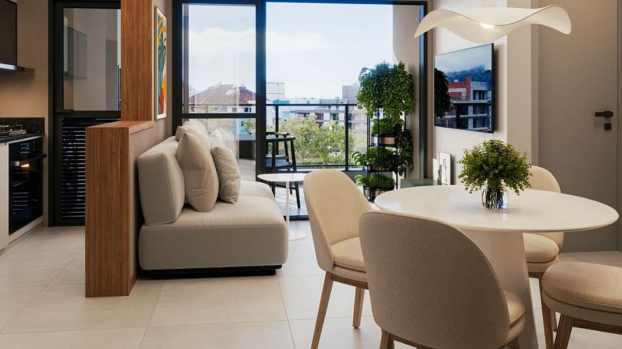 Todas as unidades contam com porcelanato em todos os ambientes, infraestrutura para ar-condicionado e varanda integrada à sala, valorizando a vista e a iluminação natural.