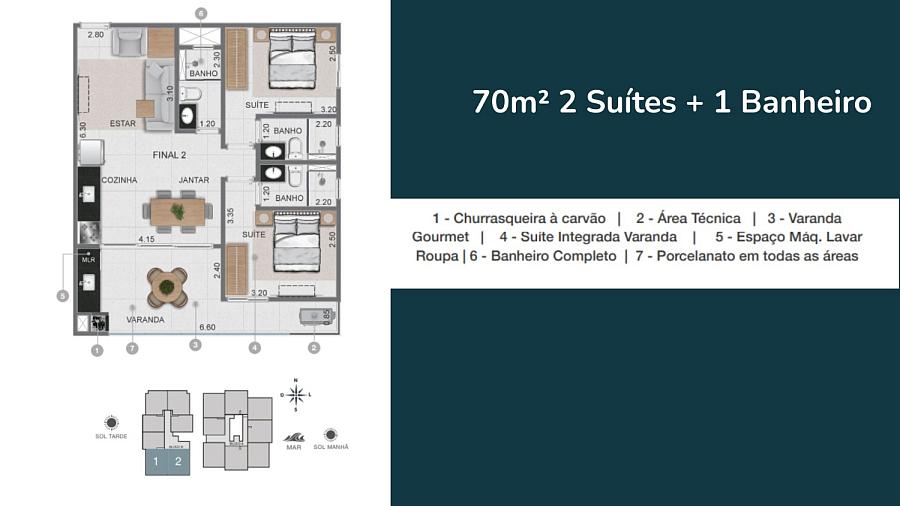 • 63m² a 70m² – 2 suítes + banheiro completo